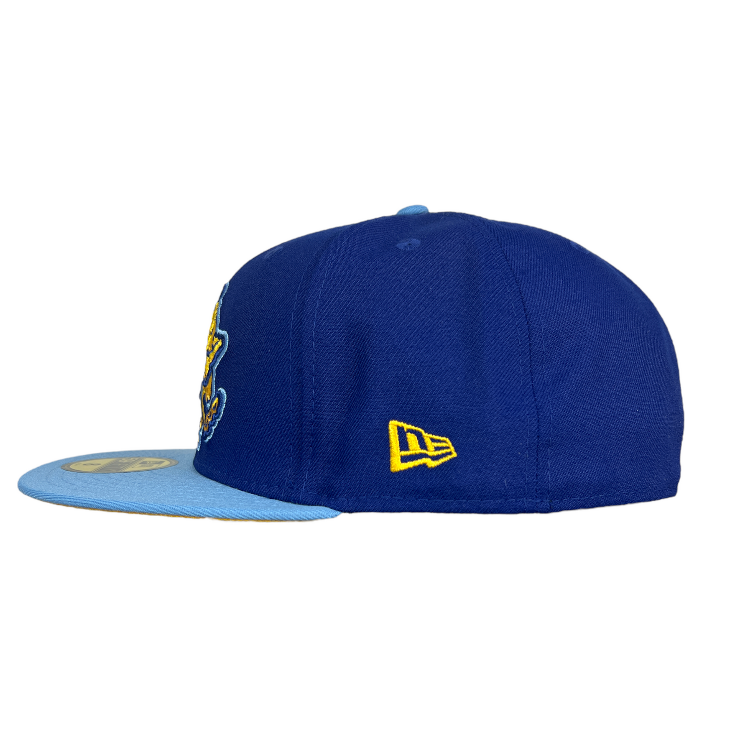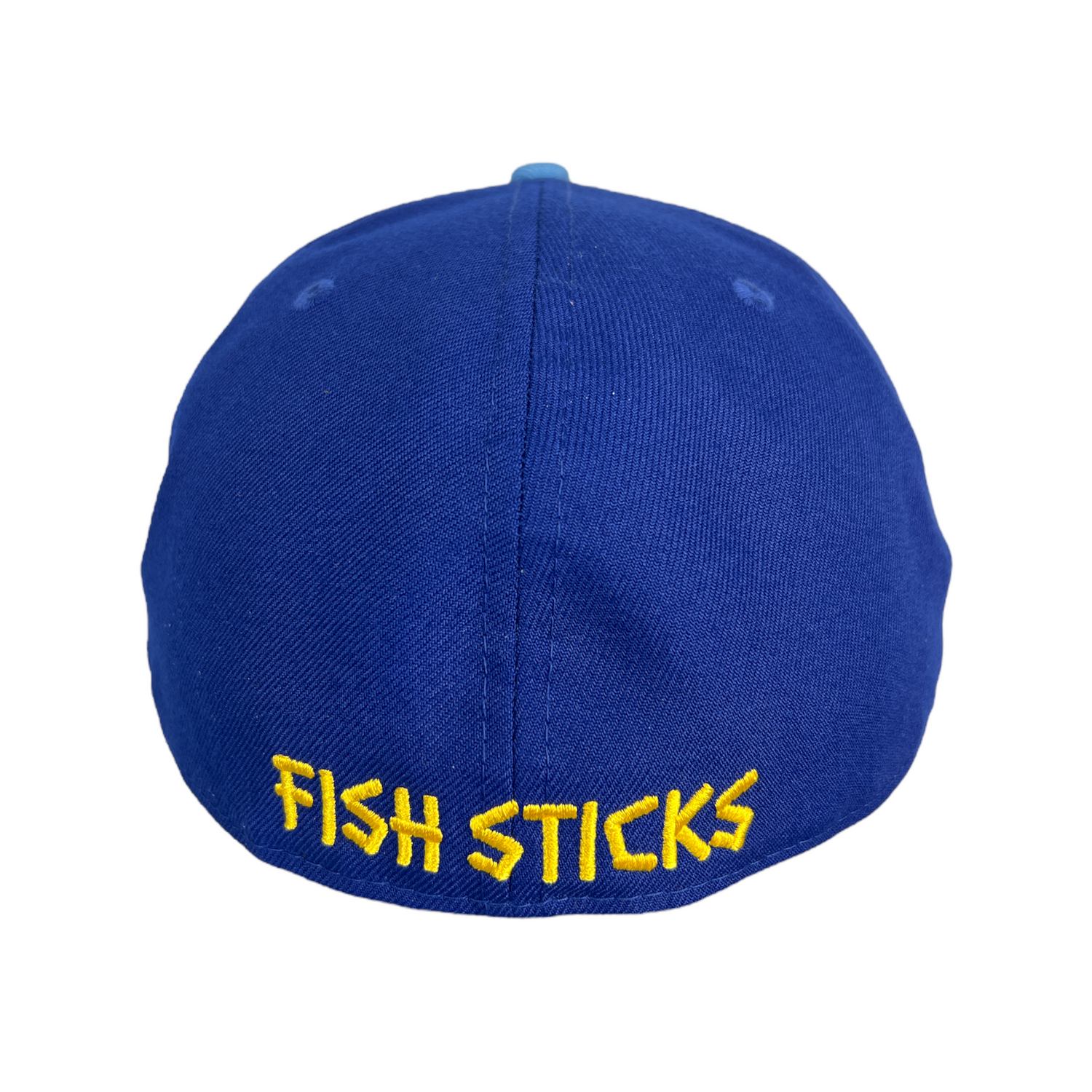 This DubSea Fish Sticks New Era 59fifty alternative hat is great for everyone looking to represent the craziest team name in baseball. You're not only going to look amazing in this hat but people will take notice. This 100% wool cap features a raised embroidered Fish Stick logo, designed by Brandiose. Hat backwards, breaded spikes on his feet and french fry bat in his Panko breaded hand. The hat features a dark royal blue crown, with light blue visor, eyelets and button. The Fish Sticks official 59fifty hats will be a great addition to your hat collection and stand out among any MILB and MLB teams.